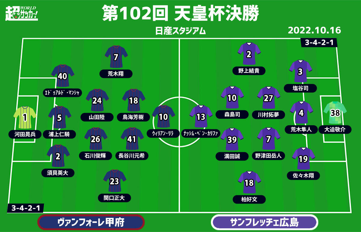 10月16日に天皇杯決勝甲府対広島の一戦が日産スタジアムで開催 試合に先立ち両チームのスターティングメンバーが発表された J1で3位につけルヴァンカップで. 天皇杯 決勝スタメン発表 甲府は初広島は9年ぶりファイナル.